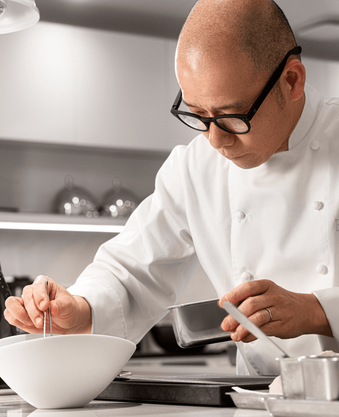 Son restaurant doublement étoilé, le Restaurant Blanc, conçu par l’architecte japonais Kengo Kuma, reflète la simplicité japonaise : un espace chaleureux et de caractère, avec une cuisine entièrement blanche symbolisant pureté et propreté, ce qui a inspiré son nom.